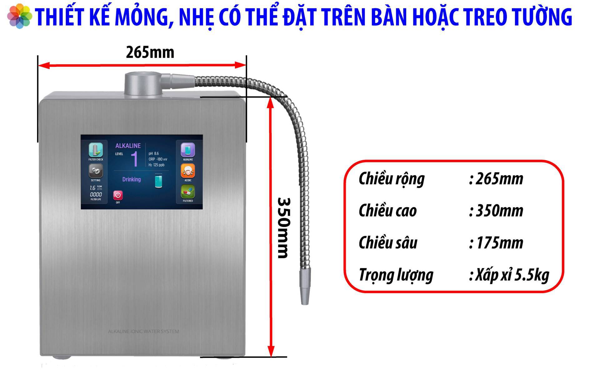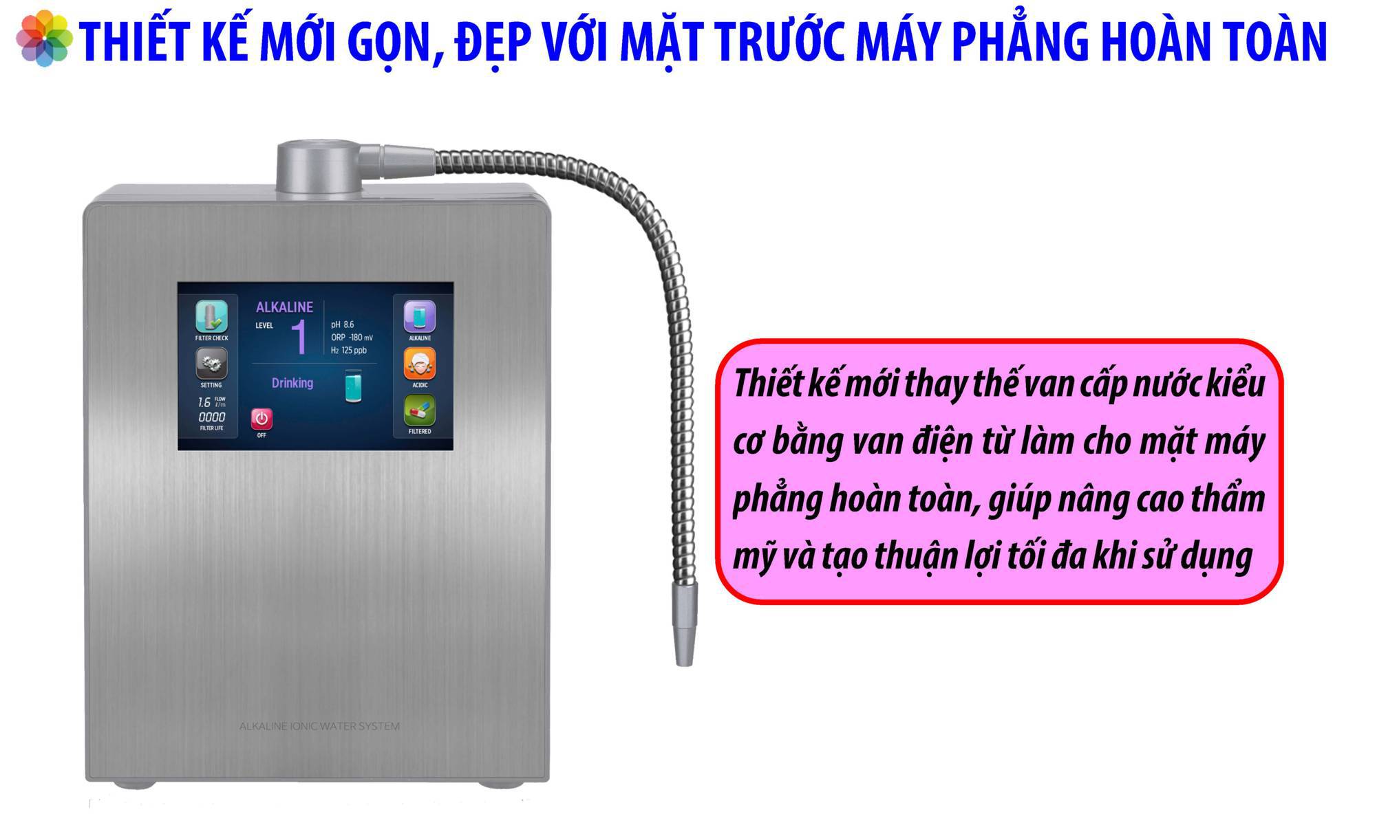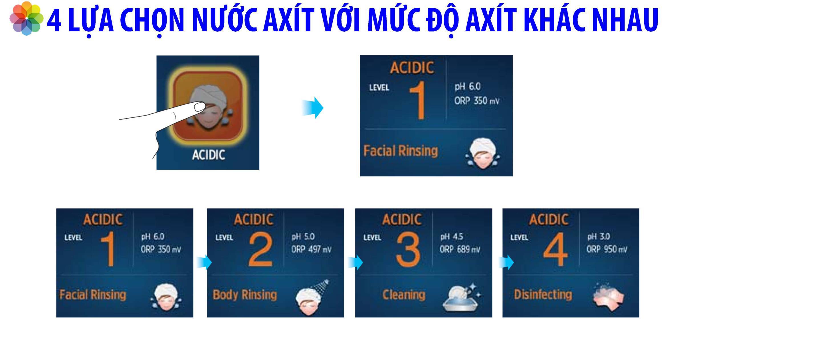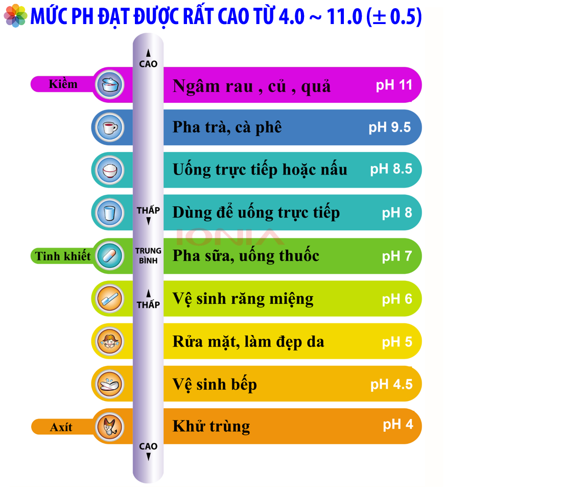 | Cho ra 9 loại nước có mức PH khác nhau | Từ pH 3.5 đến pH 11.5 |