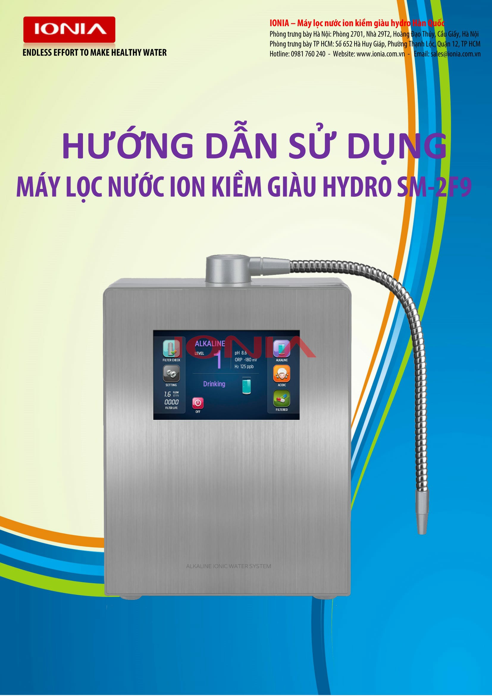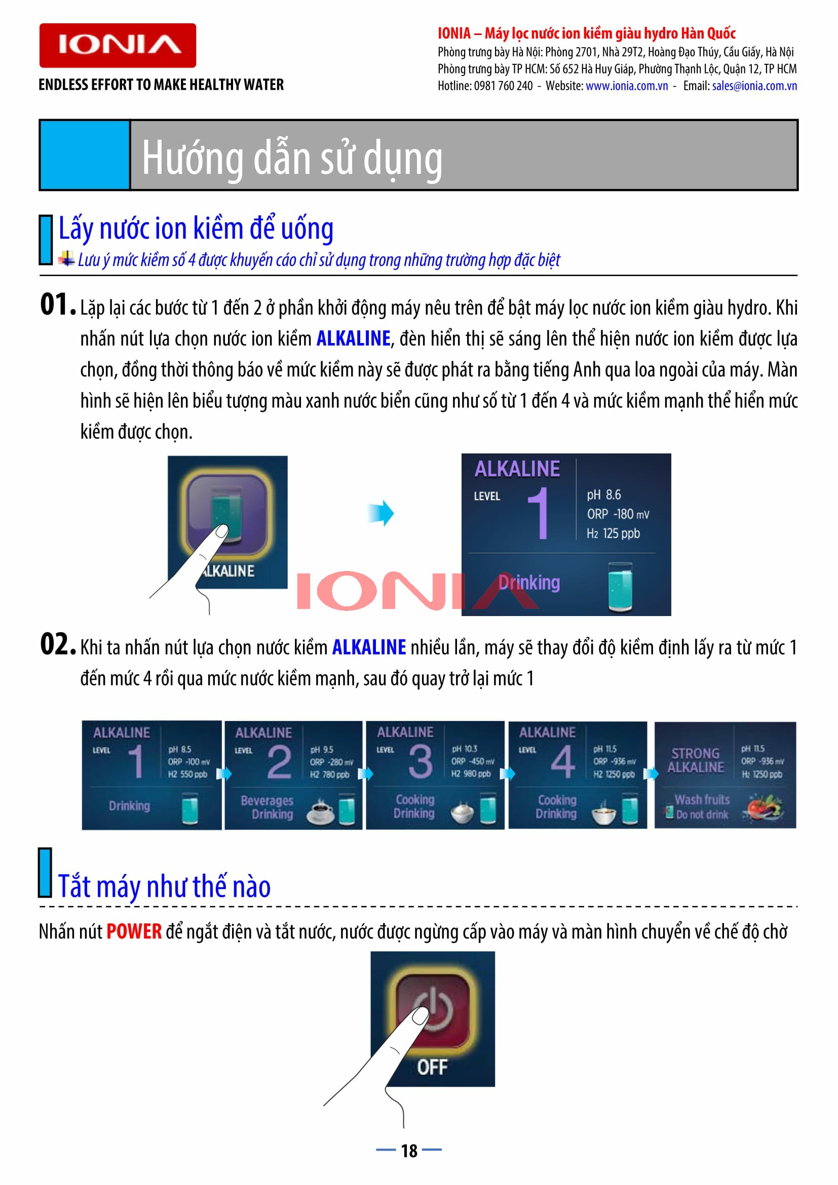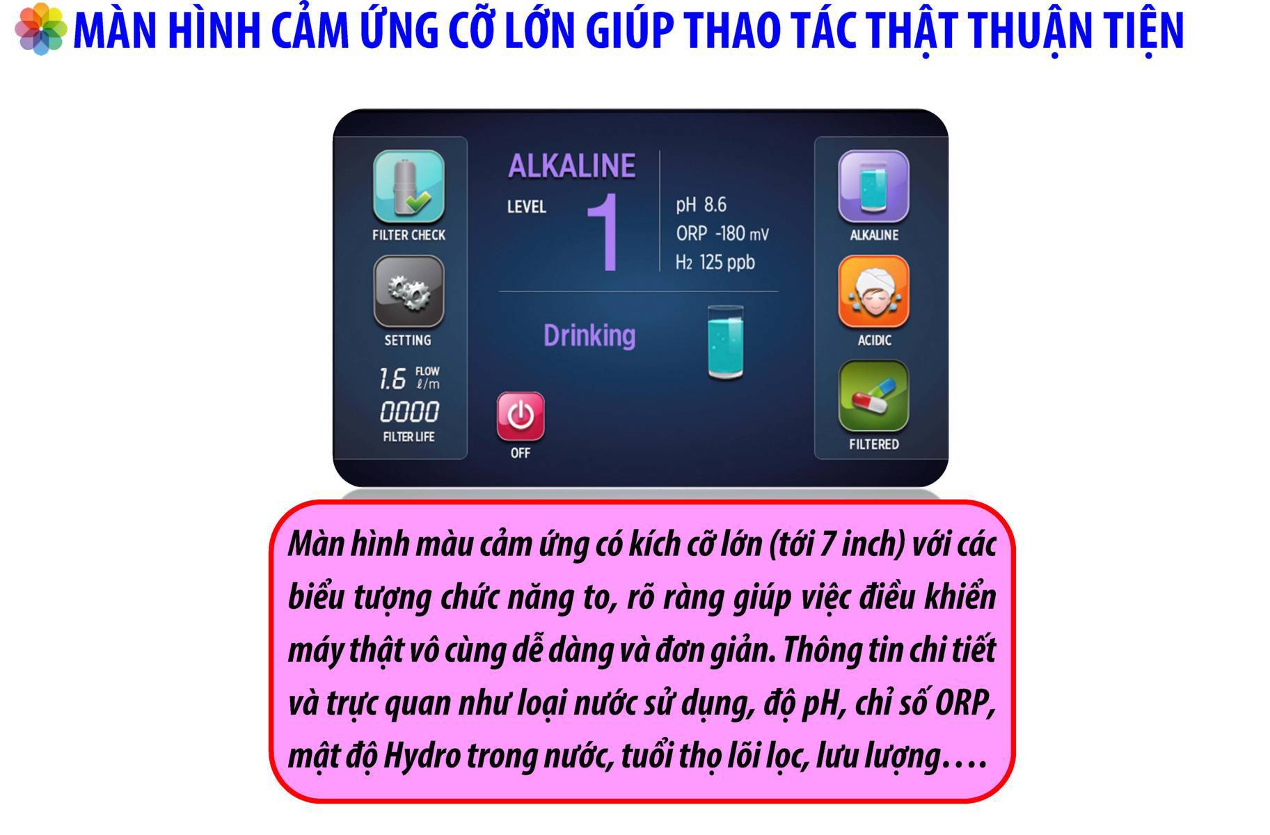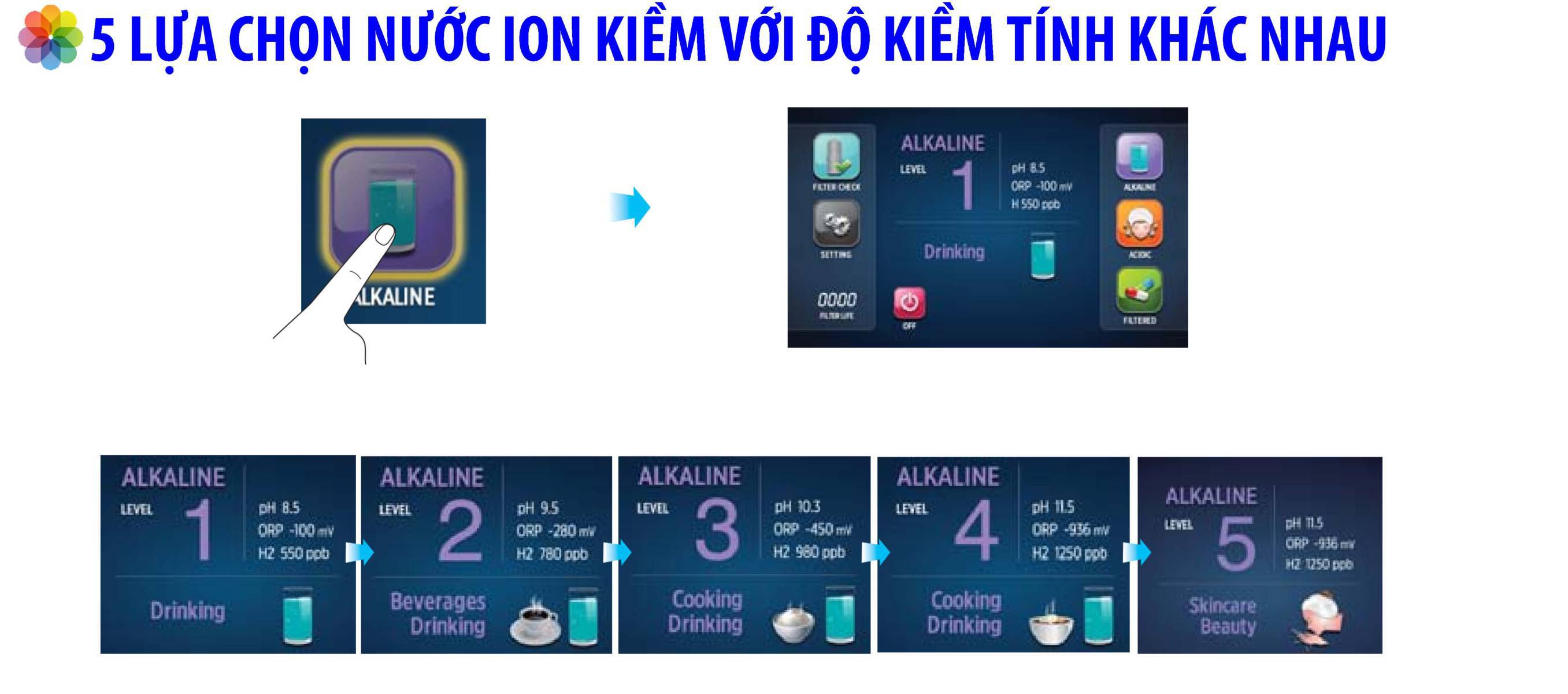 Máy lọc nước ION KIỀM giàu HYDRO tạo ra nguồn nước với độ pH từ 3.5 đến 11.5 tương ứng với 9 mức nước khác nhau sử dụng vào nhiều mục đích tốt cho sức khỏe và sắc đẹp.