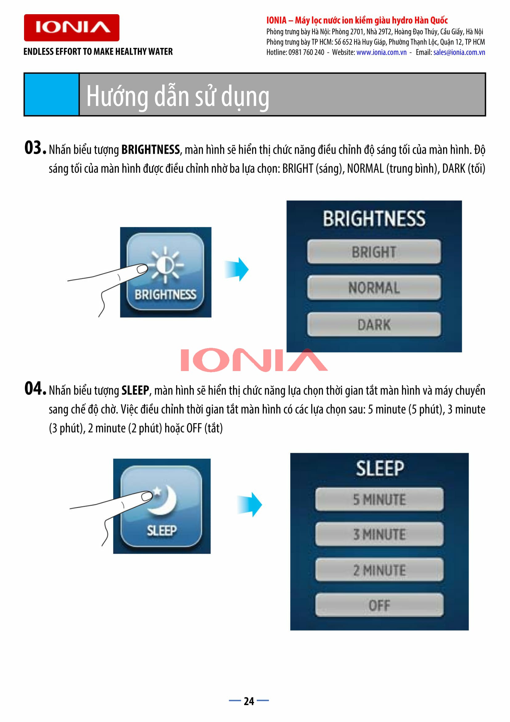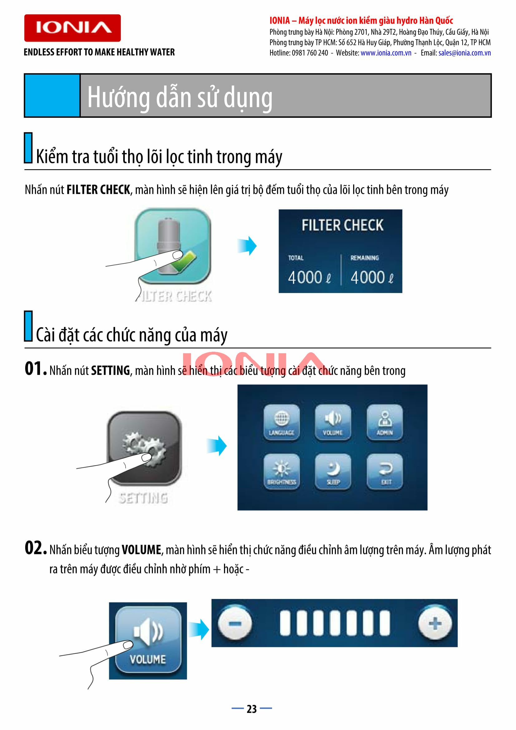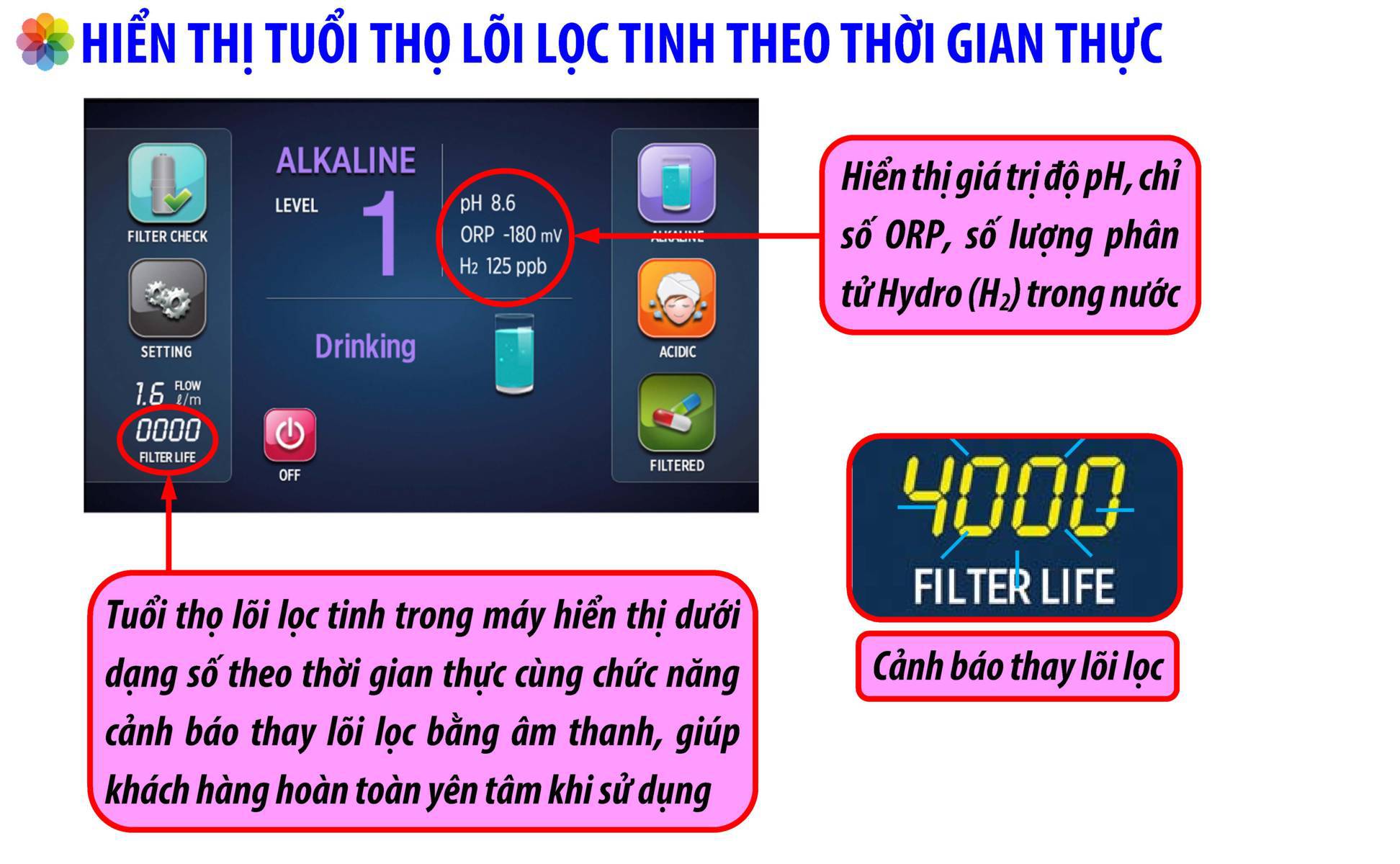 | Hiển thị tuổi thọ lõi lọc tinh trên máy | Hiển thị dạng số |