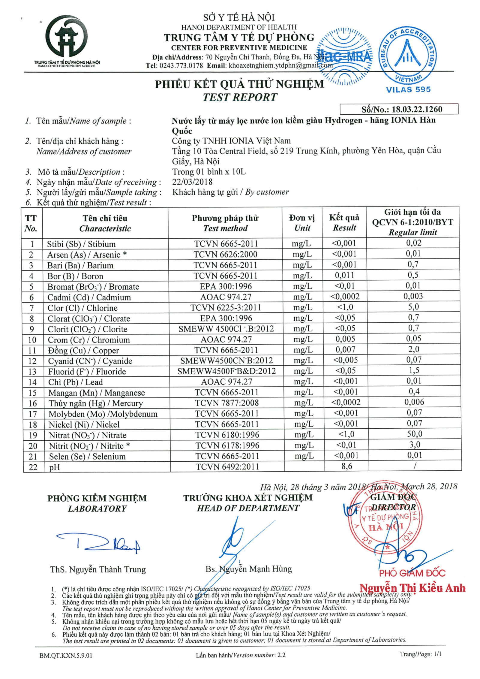 3. Chứng nhận kiểm nghiệm nước của Sở Y Tế Hà Nội- Trung tâm y tế dự phòng
