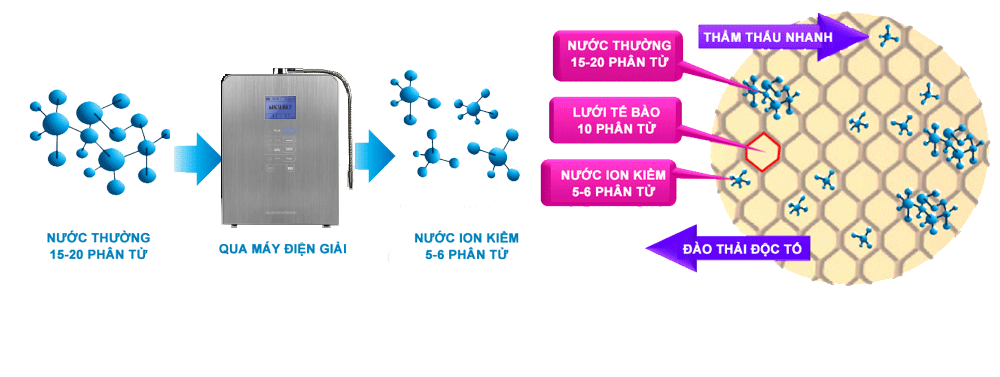 Máy lọc nước ion kiềm giàu hydro tạo ra nguồn nước ion hóa với cụm phân tử nước được thu nhỏ chỉ còn 5-6 phân tử ( trong khi nước thông thường có cụm phân tử nước từ 15-20 phân tử) giúp thẩm thấu cực nhanh và dễ dàng loại bỏ các chất độc ở những nơi khó tiếp cận nhất.